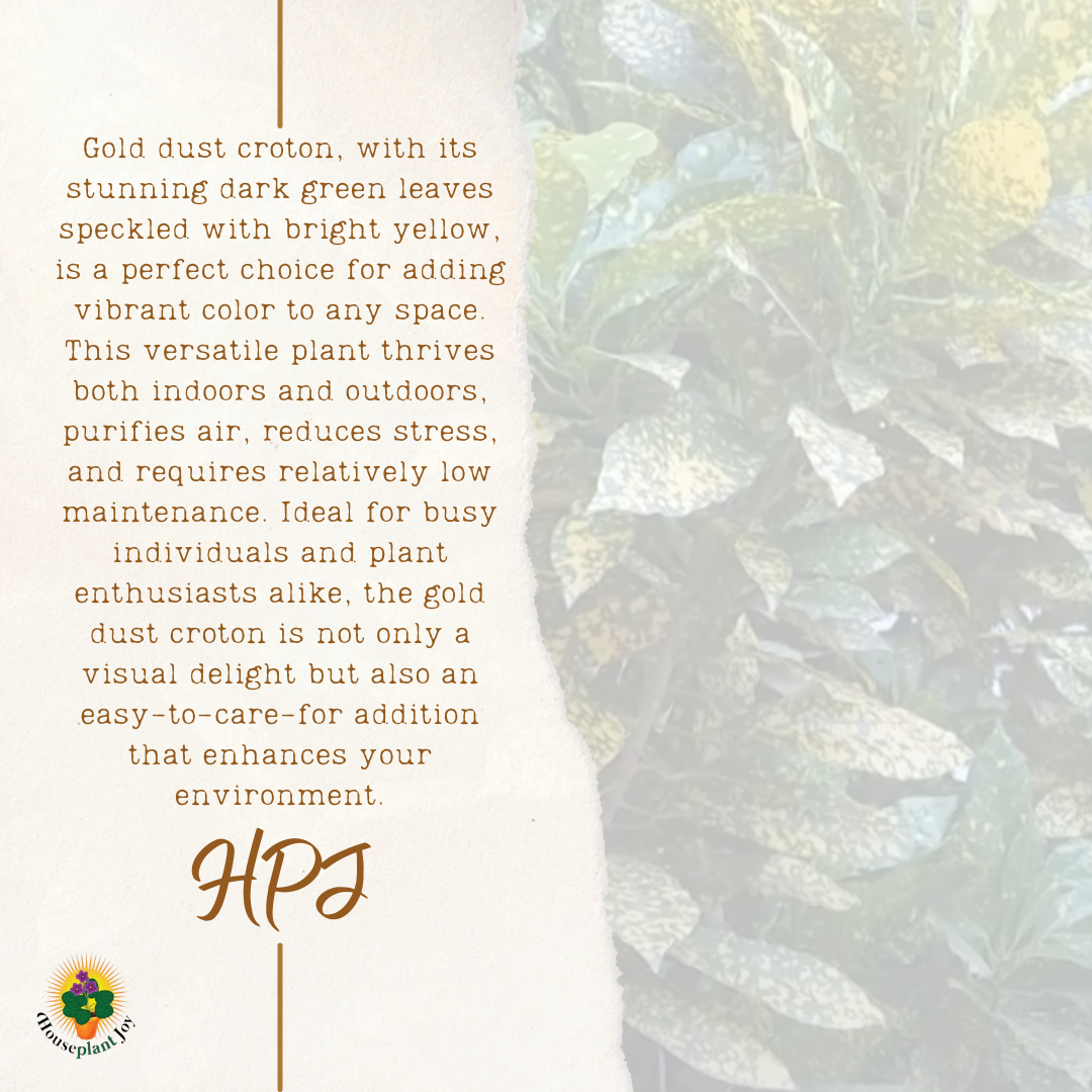Incorporating the Gold Dust Croton into your living space enhances its aesthetic appeal and contributes to a healthier indoor environment. Its air-purifying qualities and low-maintenance nature make it an ideal choice for bringing nature indoors.