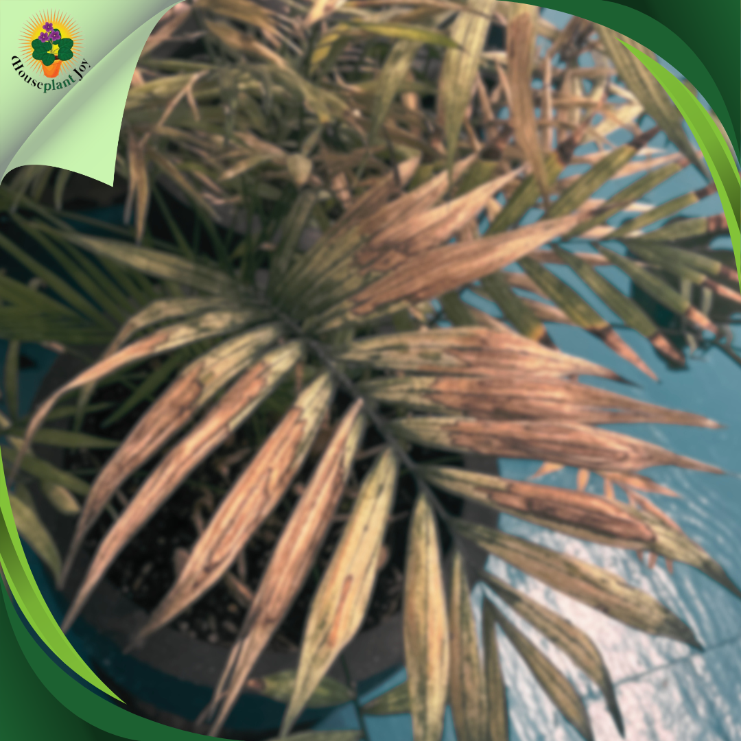 The parlor palm wilts in a warm, humid room, its leaves turning brown and brittle